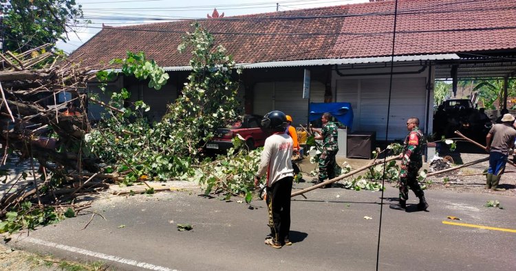 Klungkung, - Babinsa Koramil Dawan, Serka Dewa Gede Asmara bersinergi dengan aparat desa dan masyarakat setempat dalam penanganan pohon tumbang yang menghalangi akses Jalan Raya Gunaksa, Kecamatan Dawan, Kabupaten Klungkung, pada Sabtu (31/01/2026).