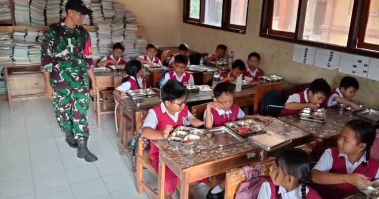 Klungkung, - Babinsa Koramil Nusa Penida, Sertu Nyoman Dayuh turut mendampingi kegiatan penyaluran makan bergizi gratis bagi para pelajar di Desa Sakti, Kecamatan Nusa Penida, Kabupaten Klungkung, pada Rabu (11/02/2026).