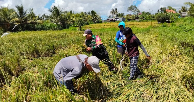 Klungkung, - Babinsa Koramil Nusa Penida, Serma Wayan Sukadana, turun langsung membantu petani melaksanakan panen padi di lahan persawahan milik warga Desa Getakan, Kecamatan Nusa Penida, Kabupaten Klungkung, Rabu (04/02/2026).