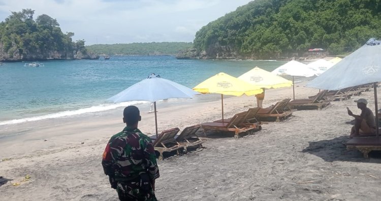 Klungkung, - Babinsa Koramil Nusa Penida, Sertu Nyoman Dayuh melakukan patroli di obyek wisata Pantai Crystal Bay, Kecamatan Nusa Penida, Kabupaten Klungkung sebagai upaya menjaga keamanan dan kenyamanan wisatawan yang berkunjung, khususnya pada saat meningkatnya aktivitas wisata.