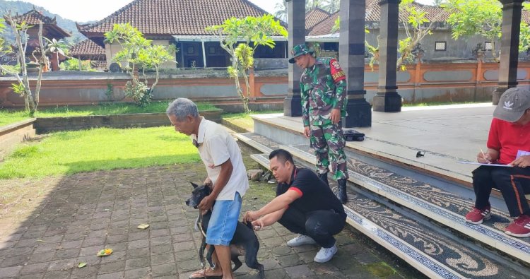 Klungkung, - Dalam upaya mencegah penyebaran rabies di wilayah teritorial, Babinsa Koramil Dawan, Sertu Wayan Suriawan, turut mendampingi pelaksanaan kegiatan vaksinasi rabies yang berlangsung di Desa Dawan Kaler, Kecamatan Dawan, Kabupaten Klungkung, Senin (20/4).